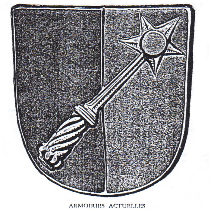 D'autre part, conformément à une interprétation populaire, le meuble héraldique y est indiqué comme étant une molette d'éperon. La masse d'armes reprend sa place dans la confirmation officielle des armoiries de la ville du 10 mai 1820 qui, pour le reste, suit l’Armorial général.