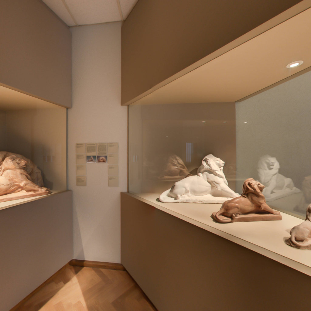 Au premier étage, meubles de famille et souvenirs personnels reconstituent le dernier appartement parisien de l’artiste. L’aile adjacente présente les maquettes du Vercingétorix de Clermont-Ferrand et du Lion de Belfort.