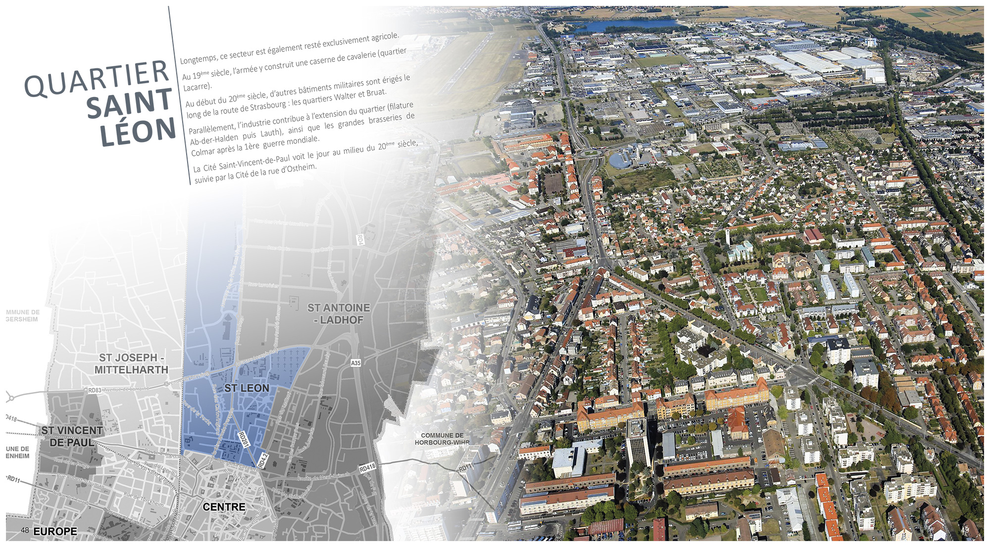 Cet ancien secteur agricole héberge dès le début du XIXe siècle le nouveau cimetière. Puis vers 1843-1845, l'armée construit une caserne de cavalerie (quartier Lacarre). Sous la période du Reichsland, d'autres bâtiments militaires sont érigés le long de la route de Strasbourg, entre autres les quartiers Walter (1905-1909) et Bruat (1912-1913). Présente dès le XIXe siècle, l'industrie contribue également à l'extension du quartier (filature Ab-der-Halden puis Lauth) ainsi que les grandes brasseries de Colmar après la 1ère guerre mondiale. La Cité Saint-Vincent-de-Paul voit le jour en 1952 avec 52 logements. C'est ensuite le tour de la Cité de la rue d'Ostheim avec 233 maisons individuelles et 3 immeubles collectifs entre 1953 et 1956.
