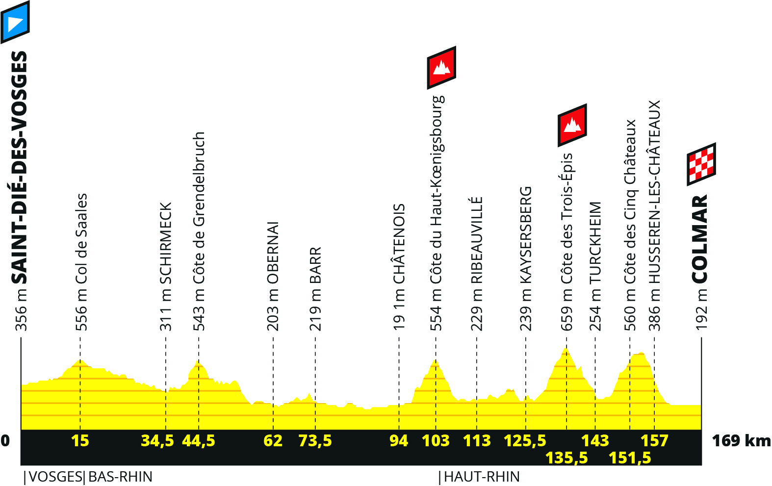 Ce parcours vosgien permettra aux visiteurs et aux téléspectateurs de profiter du château du Haut-Koenigsbourg et d’admirer les magnifiques villages alsaciens. Mais les coureurs seront ici concentrés sur leurs sensations au contact des premières ascensions de moyenne montagne, comme la côte des Trois-Épis. Un terrain d’expression privilégié pour les baroudeurs !